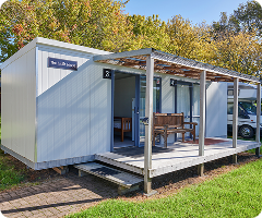 Affordable, compact cabins (3.6 m x 2.4 m) for one or two people, with desk and clothes storage. Shared kitchen, laundry, and bathrooms on site. From $45/night or $170/week. No p